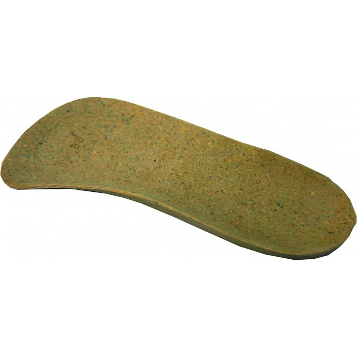 Three-quarter flexible rubber heel bed with valgus support, marked area for met pad and flat base to accept postings.